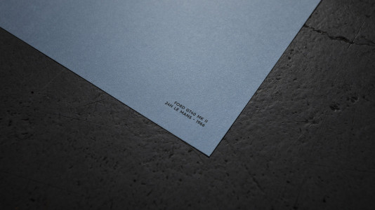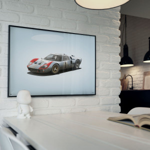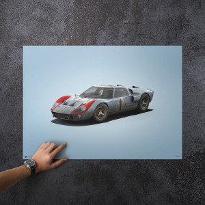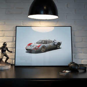 Poster připomínající dominantní vítězství Fordů GT40 v závodě 24 hodin Le Mans z roku 1966.