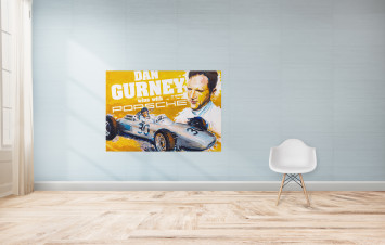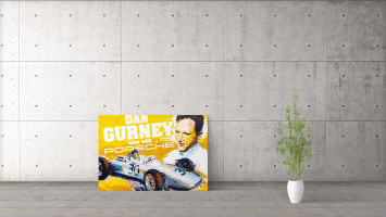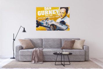 Originální obraz, na kterém je Dan Gurney. Americký jezdec, který patřil k nejlepším pilotům Formule 1. V roce 1962 zvítězil s vozem Porsche 804.