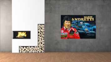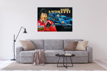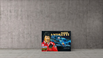 Italský pilot F1, Mario Andretti, dosáhl dechberoucích úspěchů. Tento Ital dokázal vyhrát hned 12 vítězných Velkých cen F1, sedm závodů World Sports Car Championship, 33 závodů IndyCar a mnoho dalších. V roce 1971 vyhrál Formuli 1 v Jižní Africe, kde řídil legendární Ferrari 312B. V tomto závodu dokonce Andretti dosáhl rekordu kola. Roku 1978 se stal mistrem světa s vozem Lotus 79, se kterým je i zobrazen na tomhle unikátním obrazu.