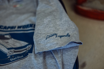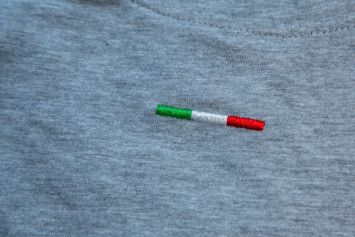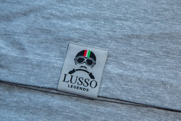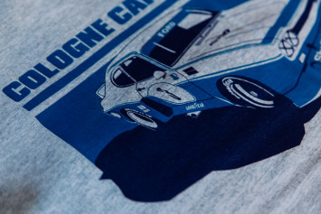 Vůz americké automobilky Ford na bavlněném tričku šedé barvy metdou sítotitku.