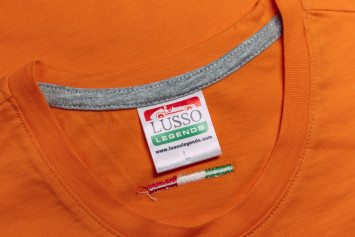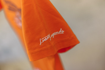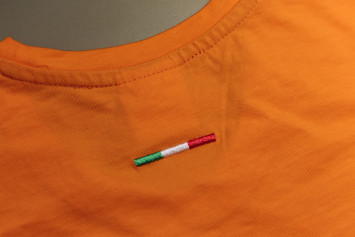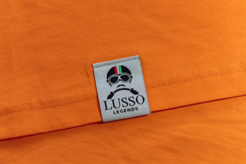 Speciální typ auta BMW na bavlněném tričku oranžové barvy metodou sítotisku.